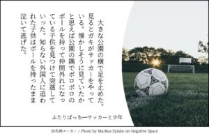 大きな公園の横で足を止めた。見るとガキがサッカーをやっている。懐かしそうに見ていたかと思えば公園の隅でボロボロのボールを持って仲間外れになっている子供を見つけて突進していった。知らない外国人に追われた子供はボールを持ったまま泣いて逃げた。