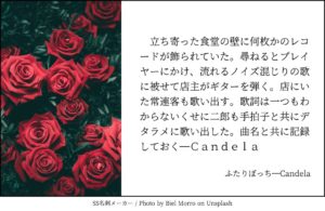 立ち寄った食堂の壁に何枚かのレコードが飾られていた。尋ねるとプレイヤーにかけ、流れるノイズ混じりの歌に被せて店主がギターを弾く。店にいた常連客も歌い出す。歌詞は一つもわからないくせに二郎も手拍子と共にデタラメに歌い出した。曲名と共に記録しておく。─Candela