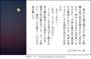 ライターに手を伸ばすと躱され、首に腕を絡めて引き寄せられる。煙草の先が触れ合った。そっと吸うと、湿気った小屋に一つだけの星が瞬いた。