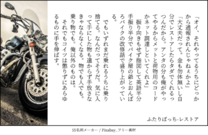 「大丈夫だって。金も勿体無いし自分でレストアしたらタダでくれるっつんだから。アンタの分も俺がやってやるからメットと荷物用のコードかネット調達しといてくれよ」