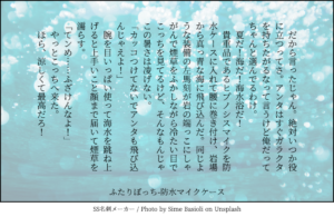 貴重品であるヒプノシスマイクを防水ケースに入れて腰に巻き付け、岩場から真っ青な海に飛び込んだ。同じような装備の左馬刻が岩の端っこにしゃがんで煙草をふかしながら冷たい目でこっちを見てるけど、そんなもんじゃこの暑さは凌げない。