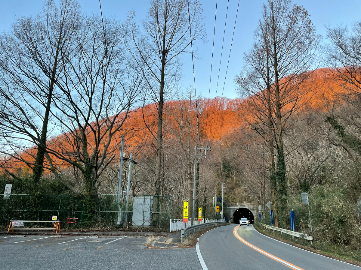 ここからまたストリートビューで追っていただけると赤い橋やトンネル、トンネルを抜けたところにある駐車場を確認できます。実際は全然こわくないです。