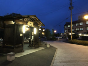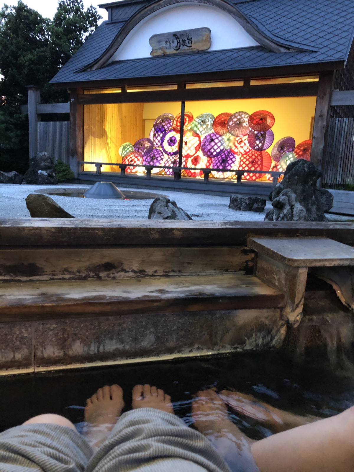 足湯の奥に小さな舞台付きの庭園があり、舞台にはきれいな和傘が飾られ、暗くなるとライトアップされます。最高にフォトジェニック。公式サイト参照。