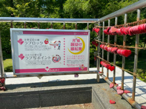 「ガラス工房びいどろ」にてラブロックキーという名前で真っ赤なハート形の南京錠が売っています。その場で名前とかを書いて、カリオンタワーの所定の場所に掛けます。