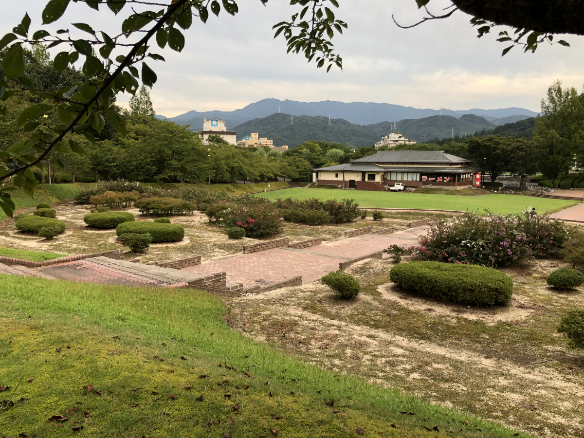 月岡温泉の端にある多目的公園。有名旅館からも徒歩数分。広い芝生エリアがあり、実際に平成の一時期にスパソニックが開催されていました。