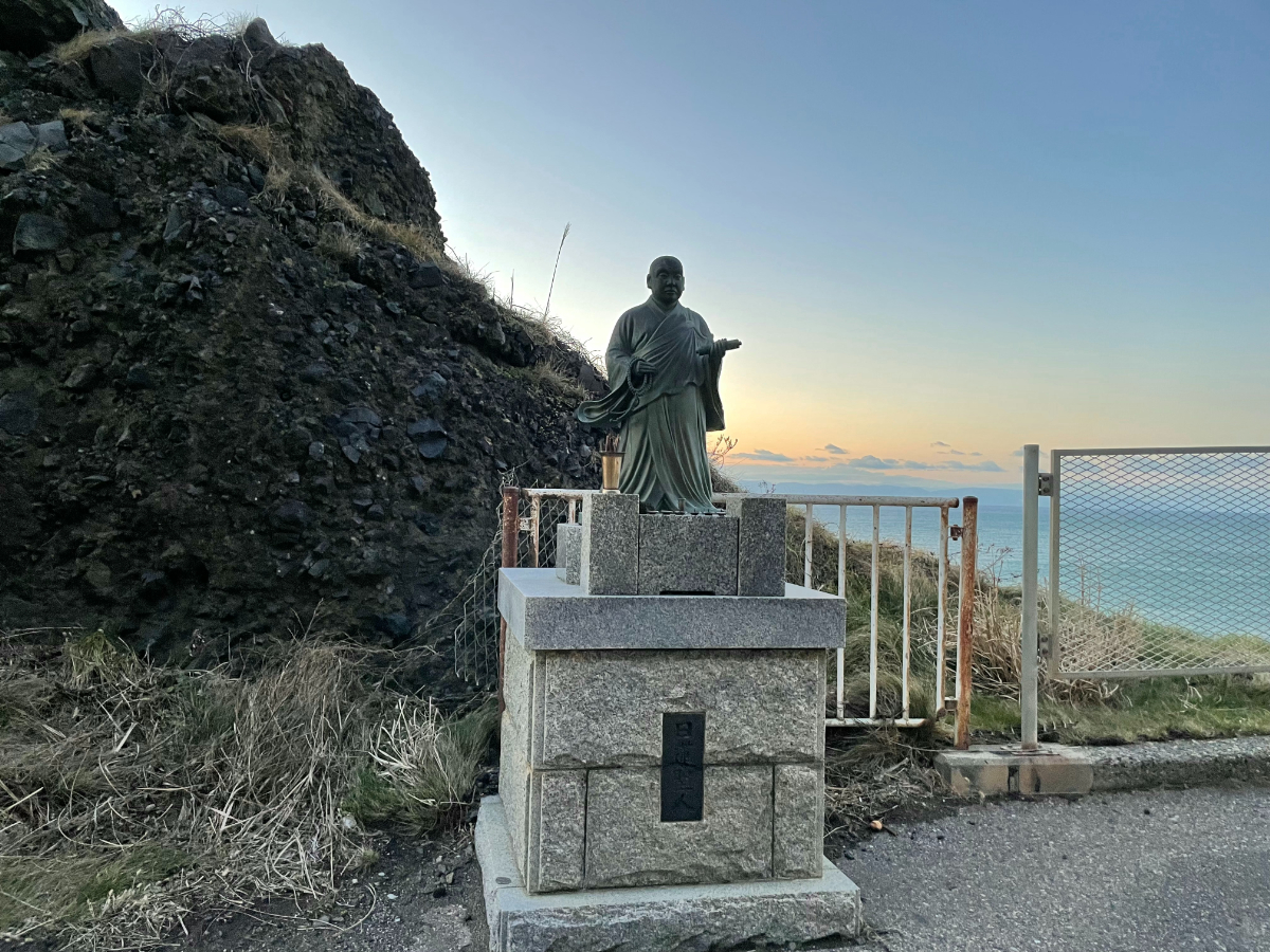 環状交差点を過ぎて道路脇の木々が途切れたら「海すげー!」ゾーンです。トンネル一つ越えて間もなく、右手に日蓮上人像。なんかすごい大自然を感じられる小浜、雷岩など見応え◎